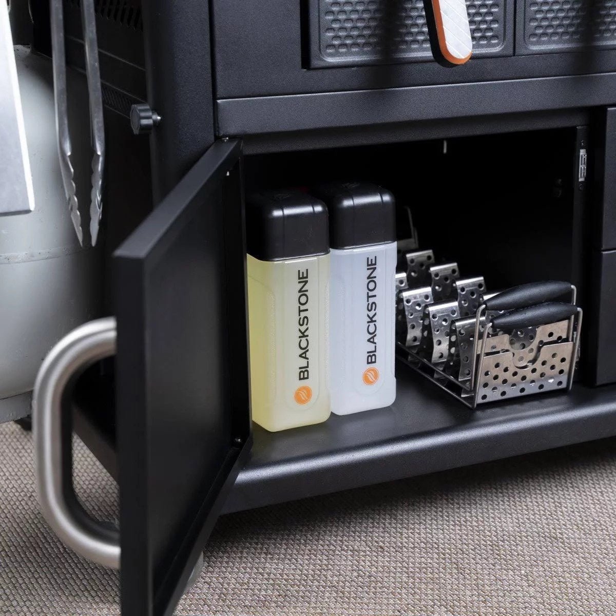 36 inch griddle station with hood. Four independently controlled cooking zones and two 4 qt airfryer drawers and one 4 qt warming drawer. This griddle station also comes with a pivoting paper towel holder, garbage bag holder and dual utility drawers for utensil storage with side cabinet.