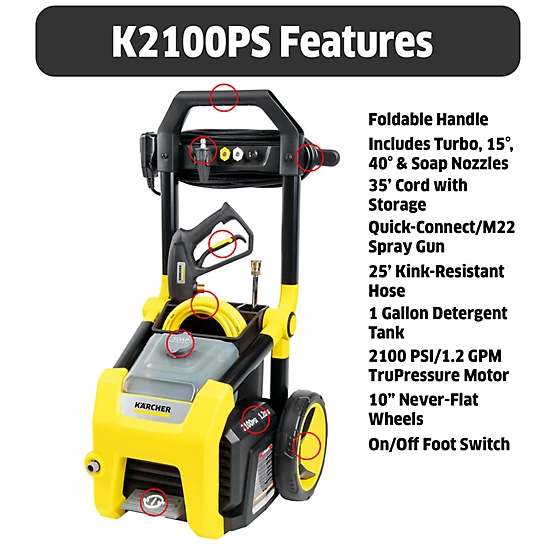 The Karcher Performance Series K2100PS Electric Pressure Washer delivers 2100 PSI of TruPressure, providing exceptional cleaning power with a rugged brushless induction motor for extended durability and quieter operation. Featuring a folding handle, onboard detergent tank, and four quick-connect nozzles, this machine is perfect for cleaning driveways, sidewalks, decks, cars, RVs, and more.