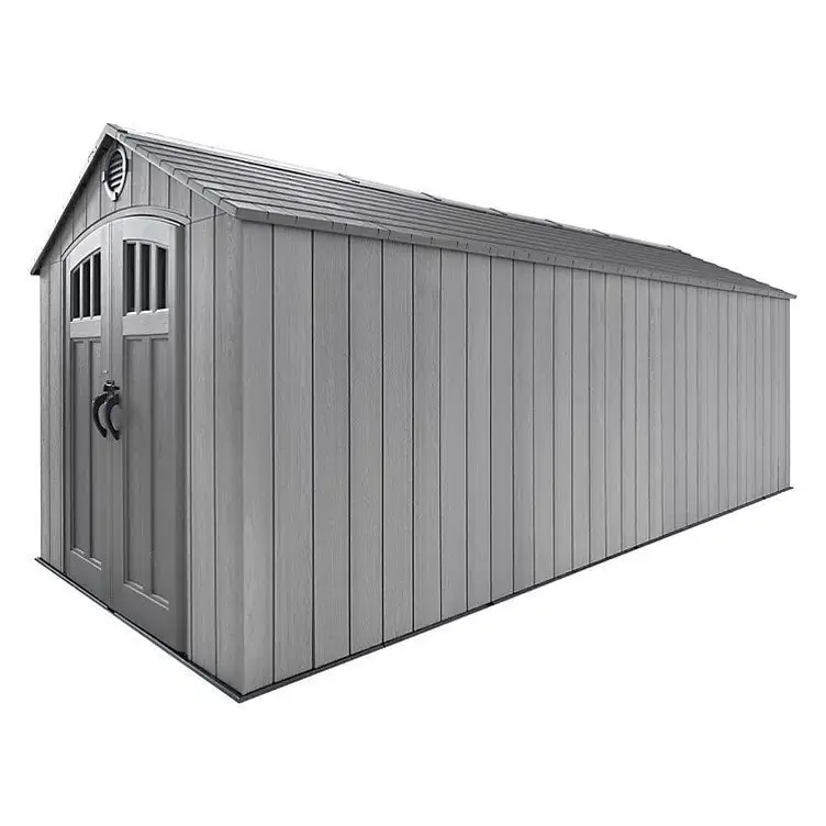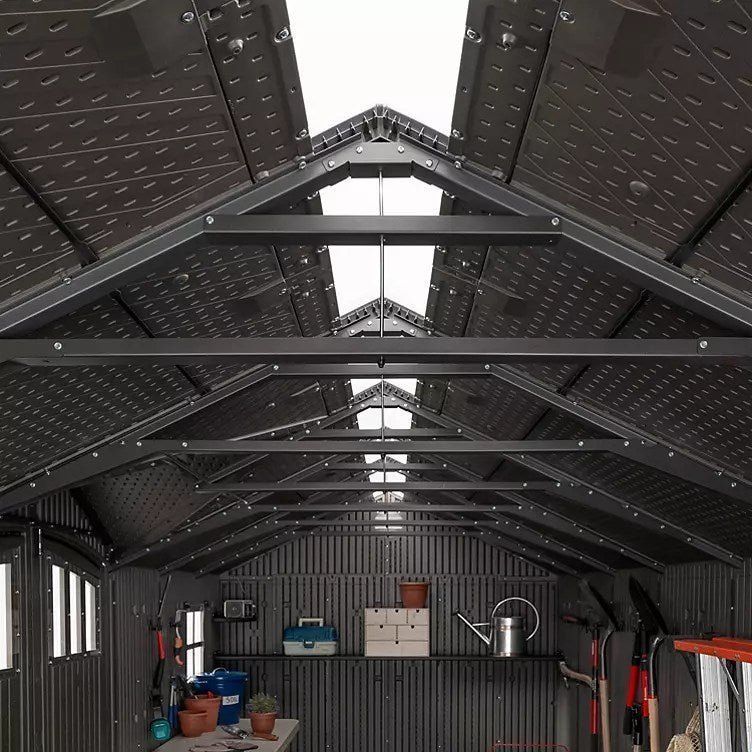 The Lifetime 15′ x 8′ Rough Cut Shed has two sets of double doors (front and side) and features: (5) A-frame heavy duty steel trusses, (6) small skylights, (2) shatter-proof polycarbonate windows with shutters, (2) screened vents, (12) wall hooks, (1) 90″ x 9″ shelf, (2) corner shelves, and a 10-year limited warranty. Floor and installation hardware included. Comes in (3) boxes. *foundation by homeowner