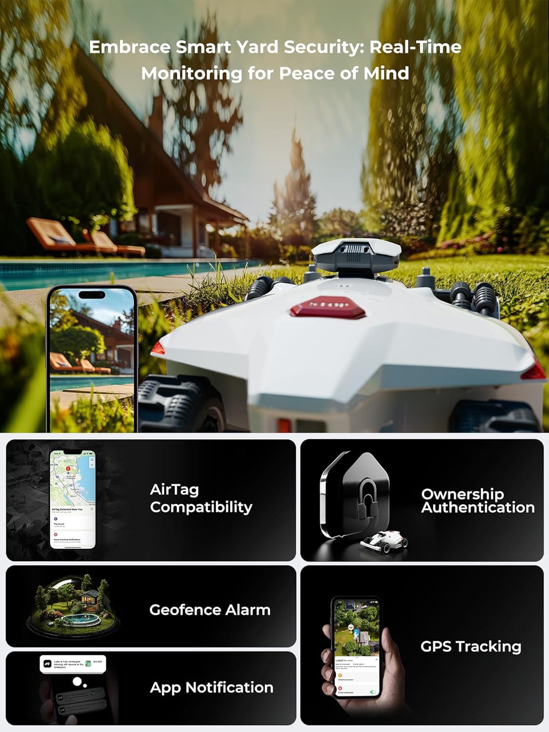 GPS Theft Protection, Never Worry About Your LUBA Lost: Equipped with anti-theft system and a built-in alarm system, if someone took your Mammotion LUBA 2 AWD 10000H lawn robot, you can instantly secure and track its location through the Mammotion App. The individual activating the device initially becomes its rightful owner. Ownership Authentication supports the “lost” feature, unauthorized users cannot operate the machine.