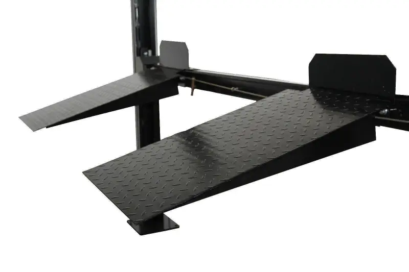 The Mayflower Blacksmith Four Post Lift Pro 8000 is a heavy-duty car lift designed for storage and service. It has a capacity of 8000 lbs and features a four post design that provides stability and strength for lifting vehicles. The lift can be used for storing vehicles and for performing maintenance and repair work on cars and trucks. The Pro 8000 has a clear floor design for easy access to the undercarriage and wheels, and its height can be adjusted to accommodate a wide range of vehicles. The lift is designed for easy and safe operation, with a locking mechanism to keep vehicles secure while lifted and an automatic safety lock system to prevent accidental lowering of the lift.