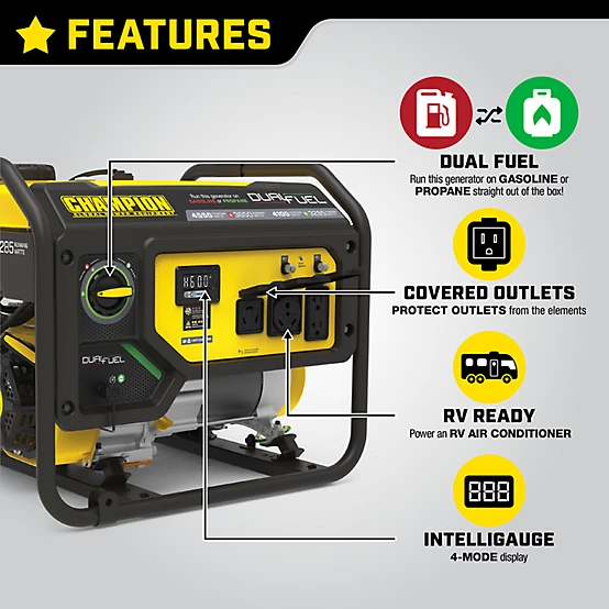 The Champion Power Equipment 200970 3650-Watt Dual Fuel Portable Generator with CO Shield is the perfect combination of versatility and convenience. Whether you need power for your home or next project, Champion Power Equipment makes powering your life more convenient than ever. You’ll appreciate the reliable recoil start, plus Cold Start Technology ensures a quick start in cold weather. Easily monitor output and track maintenance intervals with Intelligauge, which allows you to keep track of voltage, frequency and run-time hours. Designed with a low oil shut-off switch, this unit includes 0.6-quarts of 10W-30 oil. Operate your Dual-Fuel generator right out of the box on gasoline or propane, and easily switch fuels with our patented fuel select dial that allows for safe switching between fuel sources. Using gasoline, the 224cc Champion engine produces 4550 starting watts and 3650 running watts, and will run for 14 hours at 50% load when the 4.7-gallon fuel tank is full. It produces 4100 starting watts and 3285 running watts, and will run for 10.5 hours at 50% load when using a 20-pound propane tank. Also included is a 6.5-foot propane hose with a built-in regulator. With a noise level of 68 dBA from 23 feet, which is a bit louder than a vacuum, this machine can provide home backup in an outage, plus the Volt Guard built-in surge protector prevents overloads and keeps your appliances and equipment safe. All the outlets have covers for protection and include a 120V 30A (TT-30R) RV outlet, a 120V 30A outlet (L5-30R), and a 120V 20A household duplex outlet (5-20R). Champion’s thoughtful packaging and clear directions make setup hassle free. Buy this EPA certified and CARB compliant generator with confidence – Champion Support and our nationwide network of service centers will back up your purchase with a 3-year limited warranty and FREE lifetime technical support. CO Shield technology monitors the accumulation of carbon monoxide (CO), a poisonous gas produced by engine exhaust when the generator is running. If CO Shield detects unsafe elevated levels of CO gas, it automatically shuts off the engine. CO Shield is not a substitute for an indoor carbon monoxide alarm or for safe operation. DO NOT allow engine exhaust fumes to enter a confined area through windows, doors, vents or other openings. Generators must ALWAYS be used outdoors, far away from occupied buildings with engine exhaust pointed away from people and buildings. Meets the requirements of ANSI/PGMA G300-2018.Includes: Propane (LPG) Hose, Engine Oil, Oil Funnel